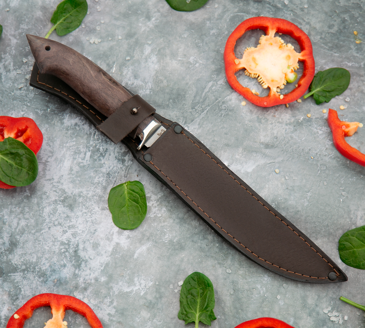 Филейный нож из нержавеющей стали N690, рукоять - стабилизированная карельская береза, кожаный чехол в комплекте.