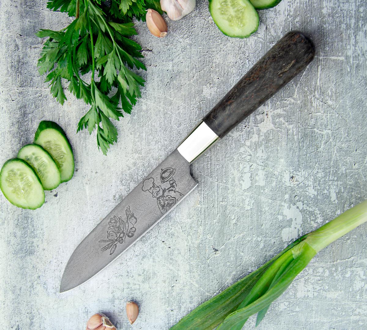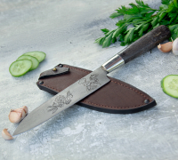 Нож Сантоку из булатной стали, рукоять - стабилизированная карельская береза, кожаный чехол идет в комплекте.