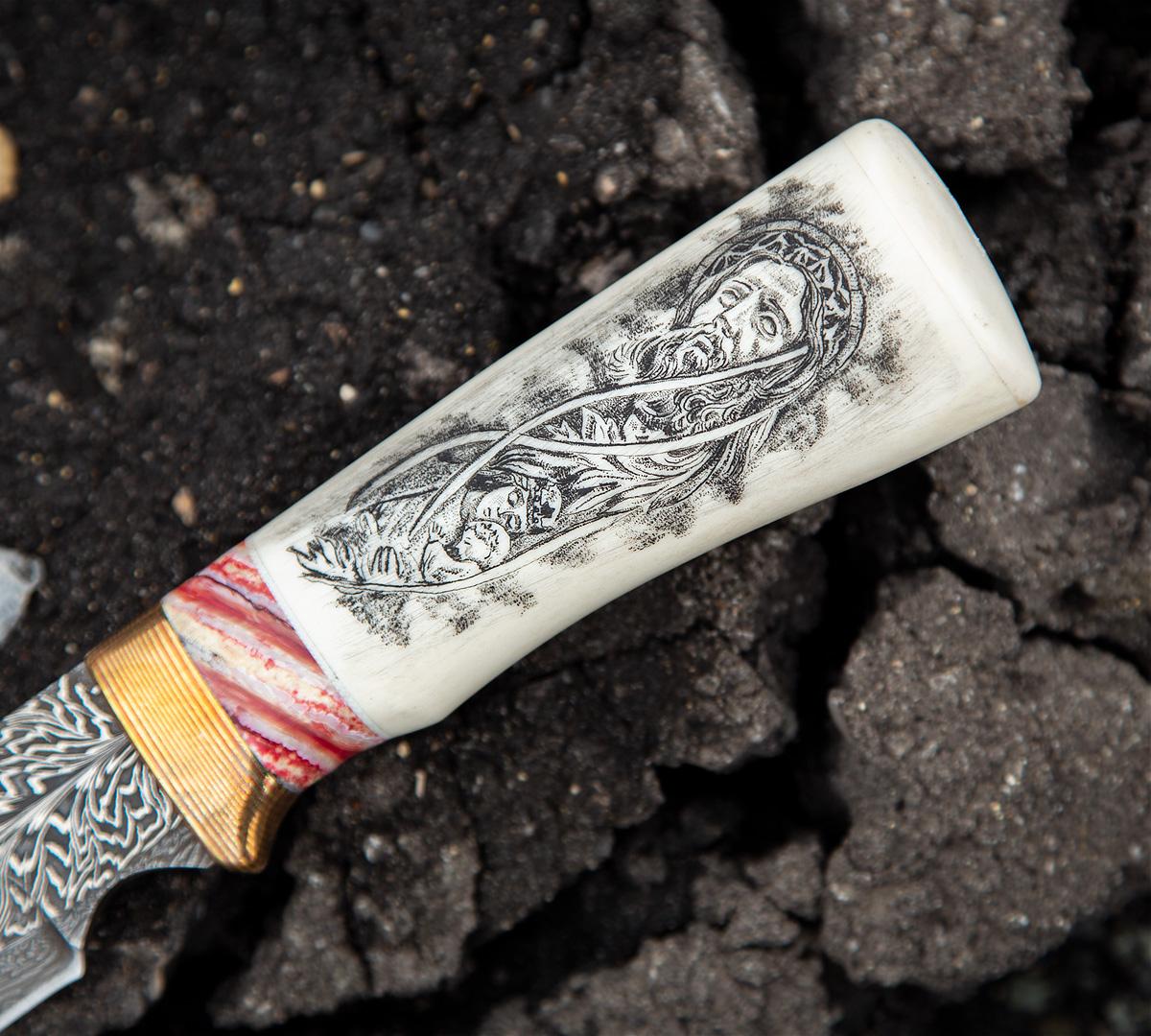 Нож Гефест из мозаичной дамасской стали, рукоять - клык моржа, зуб мамонта, мокуме, скримшоу. Формованный чехол идет в комплекте.