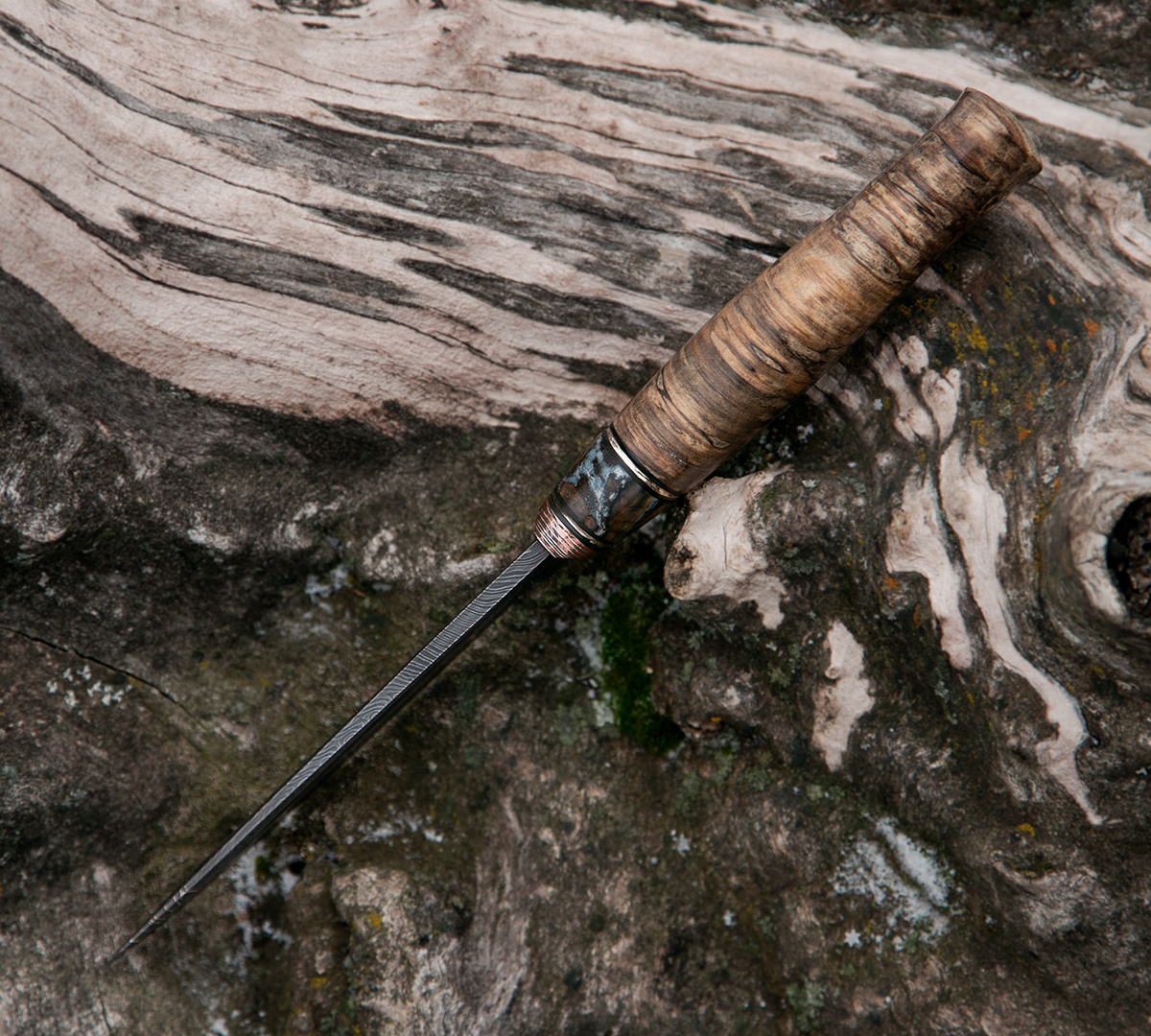 Нож Ладья из мозаичной дамасской стали, рукоять - шпальт, стабилизированный зуб мамонта. Формованный чехол идет в комплекте.