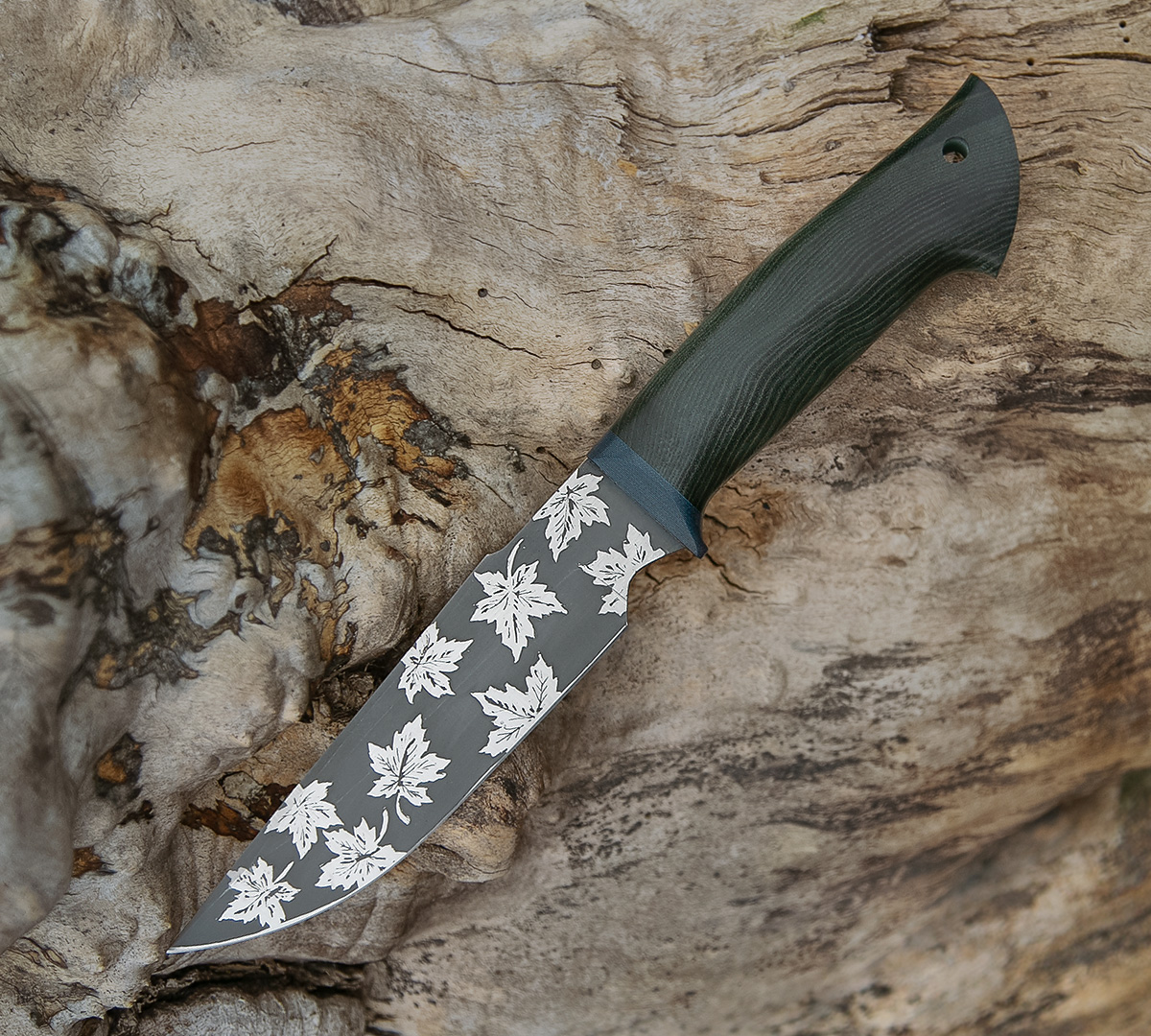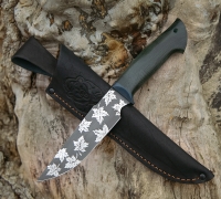 Нож Гефест из порошковой нержавеющей стали М-398 с травлением, рукоять - стабилизированный дальневосточный ясень, кожаный чехол в комплекте.