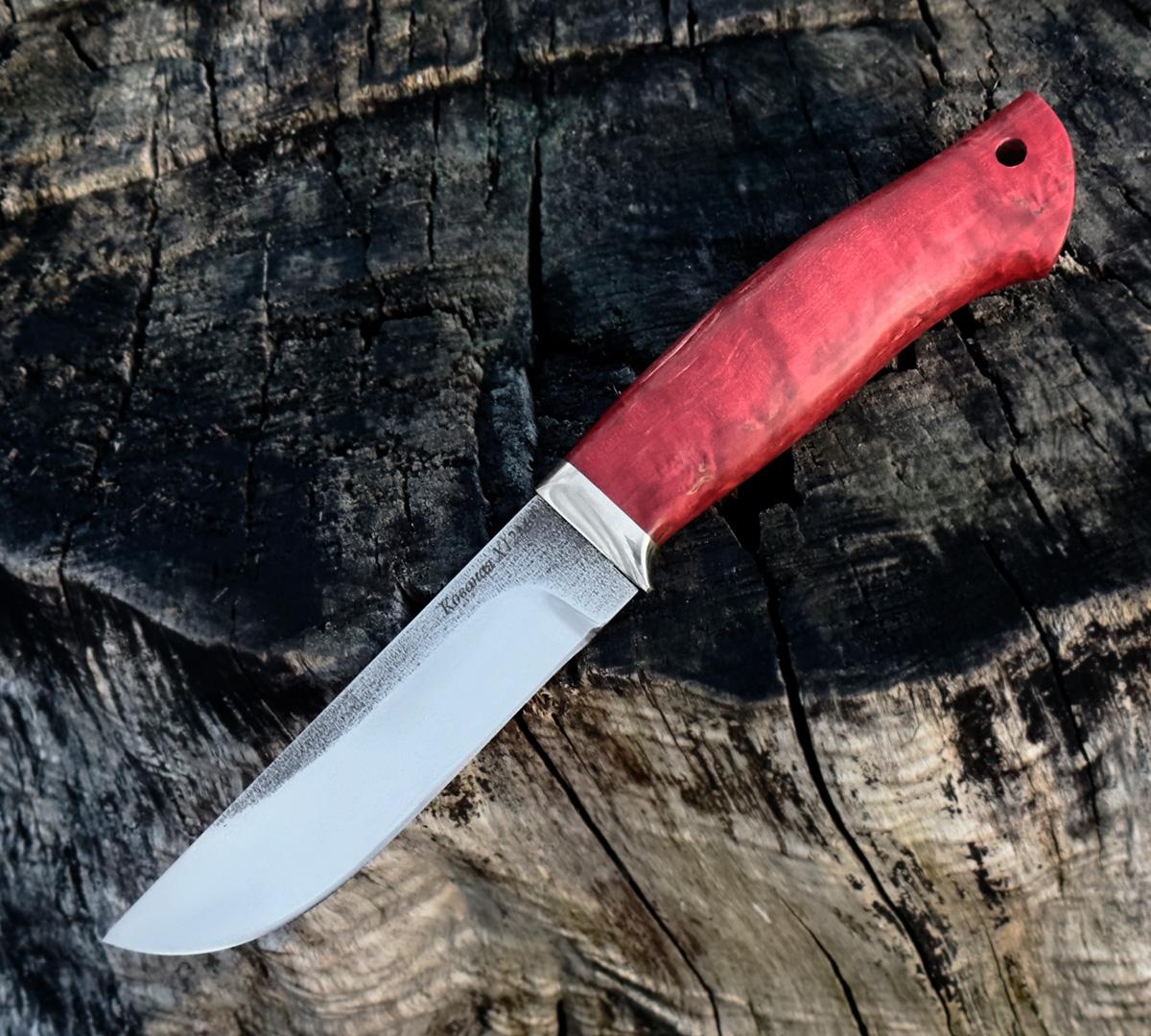 Нож Белка из кованной стали Х12МФ, рукоять - стабилизированная карельская береза, кожаный чехол идет в комплекте.