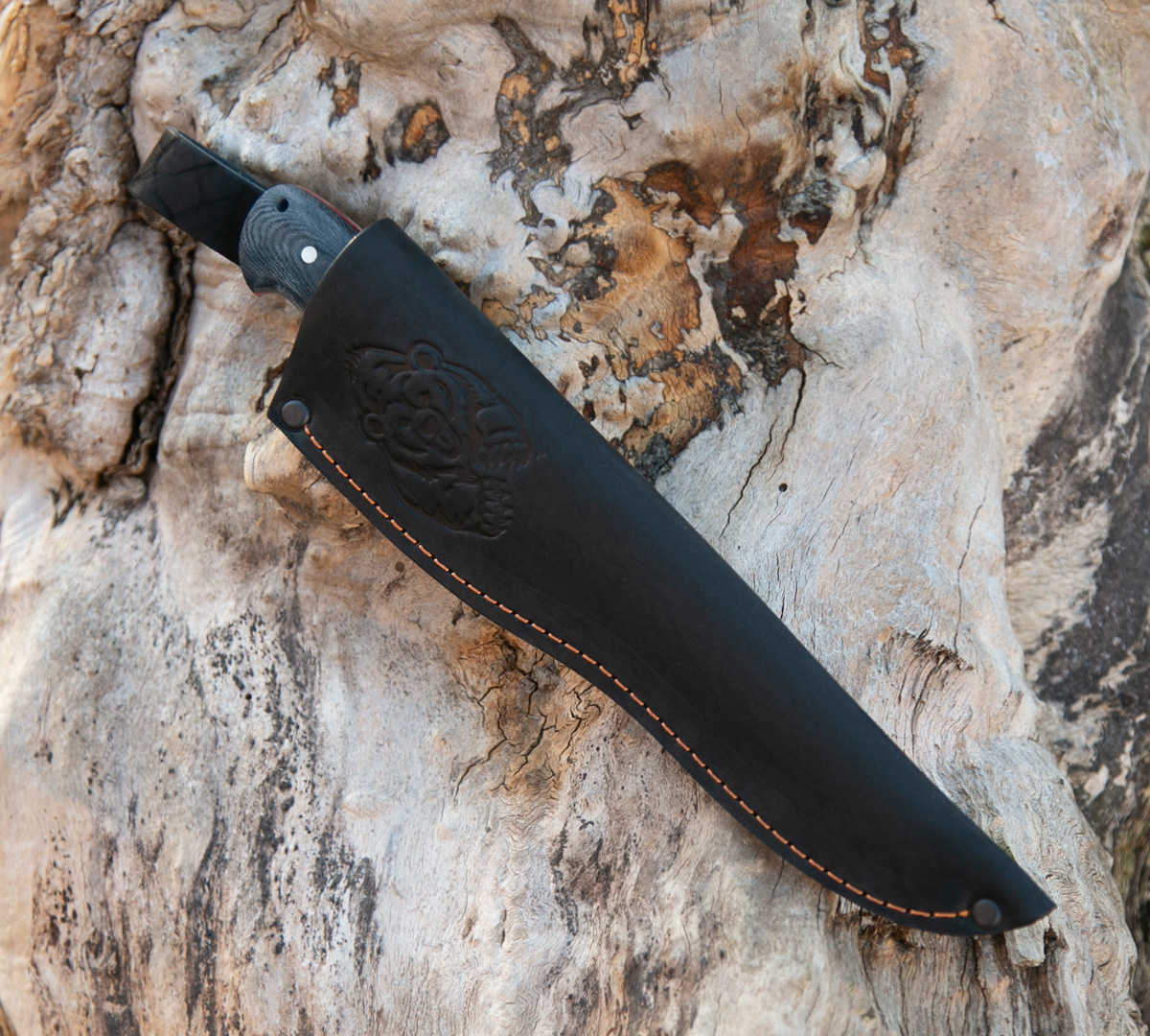 Цельнометаллический нож Ладья из нержавеющей стали VG-10, рукоять - G10. Кожаный чехол в комплекте (может отличаться от фото)